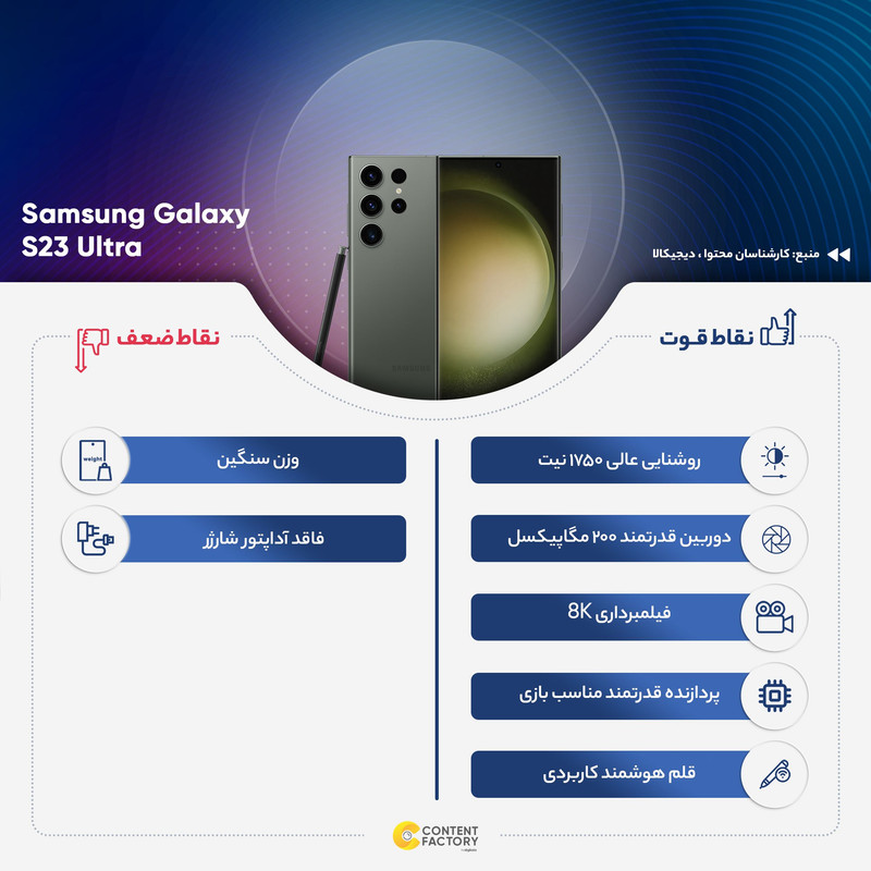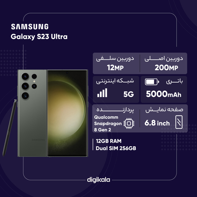 سامسونگ Galaxy S23 Ultra بهعنوان گل سرسبد گوشیهای هوشمند خانواده S23 با بهره بردن از مشخصات فنی قدرتمند معرفی شد. در نگاه اول از نظر طراحی در نظر گرفته شده، سامسونگ Galaxy S23 Ultra به نسبت نسل قبلی یعنی Galaxy S22 Ultra تغییرات زیادی نداشته و تقریبا هر دو گوشی از طراحی مشابهی بهره بردند. اما باید بدانید که Galaxy S23 Ultra به نسبت نسل قبلی، قدرتمندتر از همیشه وارد میدان رقابت شده است. در نمای روبهرویی این گوشی به صفحهنمایش شگفتانگیز با ابعاد 6.8 اینچ و رزولوشن 1440×3088 پیکسل از نوع Dynamic AMOLED 2X مجهز شده. از جمله قابلیتهای قدرتمند این صفحهنمایش میتوانیم به توانایی نمایش 501 پیکسل در هر اینچ، نرخ بروزرسانی 120 هرتز و حداکثر روشنایی 1750 نیت (nits) اشاره کنیم. تمام این مشخصات سبب شدهاند تا صفحهنمایش این گوشی، هرآنچه که از یک صفحهنمایش گوشی پرچمدار توقع دارید را برآورده کند. برای سنسورهای قسمت پشتی هم سامسونگ دست به تغییر جدیدی زد و این بار سنسور دوربین عریض با رزولوشن 200 مگاپیکسل را برای این گوشی هوشمند در نظر گرفت. سنسوری که بدون هیچ شکی توانایی ارائه عملکرد فوقالعادهای در نور روز و نور شب دارد. سنسور 10 مگاپیکسل از نوع پریسکوپتلهفوتو با توانایی زوم 10 برابری اپتیکال در کنار سنسور 10 مگاپیکسل از نوع تلهفوتو با قابلیت زوم 3 برابری اپتیکال و سنسور 12 مگاپیکسل از نوع فوق عریض (ultrawide)، دیگر سنسورهای دوربین قسمت پشتی این گوشی را تشکیل میدهند. سنسور دوربین عریض این گوشی توانایی ضبط ویدیو با حداکثر کیفیت 8K و سرعت 30 فریم در ثانیه را هم دارد. برای دوربین سلفی، سنسور با رزولوشن 12 مگاپیکسل در نظر گرفته شده که توانایی ضبط ویدیو با حداکثر کیفیت 4K و سرعت 60 فریم در ثانیه را دارد. حضور پردازنده قدرتمند اسنپدراگون 8 نسل دو شرکت کوالکام هم سبب شده تا سامسونگ Galaxy S23 Ultra بهراحتی هرچه تمامتر از پس اجرای بازیهای سنگین و باگرافیک بالا بربیاید. باتری با میزان ظرفیت 5000 میلیآمپرساعت و پشتیبانی از فناوری شارژ سریع با توان 45 وات هم از دیگر مشخصات در نظر گرفته شده برای این گوشی هوشمند است. قلم هوشمند S-Pen هم با قابلیتهای جذاب این گوشی را همراهی میکند.