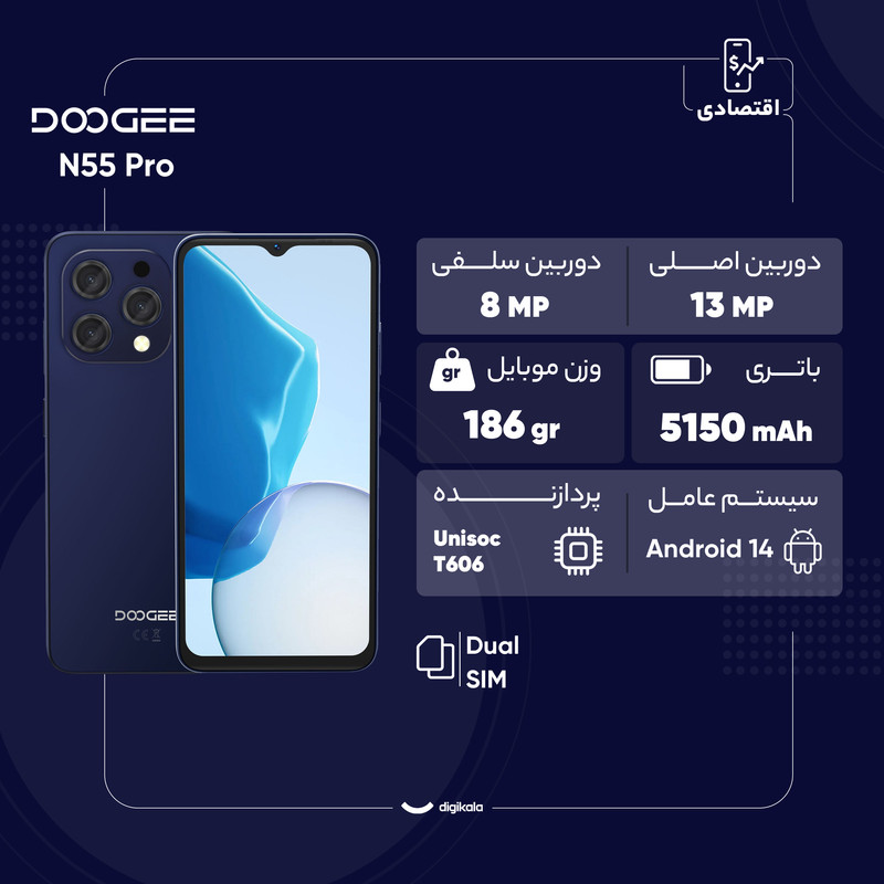 Doogee N55 Pro در سال 2024 معرفی شد و نسخهای ارتقایافته از مدل N55 به شمار میرود. این گوشی با طراحی ساده، لبههای خمیده، ضخامت 8.6 میلیمتر و وزن 186 گرم، حس راحتی را در استفاده روزمره ارائه میدهد. صفحهنمایش 6.56 اینچی IPS LCD با نرخ تازهسازی 90 هرتز، تجربهای روان را فراهم میکند. این صفحه نمایش با رزولوشن 720 در 1612 تراکم پیکسلی 269 دارد و روشنایی صفحه آن به 350 نیت میرسد. یکی از مهمترین بهبودهای این مدل، حافظه داخلی 256 گیگابایتی و رم 6 گیگابایتی آن است. این مشخصات، همراه با پردازنده Unisoc T606، عملکرد خوبی برای کارهای روزمره مثل تماشای ویدیو، وبگردی و اجرای بازیهای سبک ارائه میدهد. دوربین اصلی 13 مگاپیکسلی، عکسهای مناسبی در نور کافی ثبت میکند و دوربین سلفی 8 مگاپیکسلی نیز برای تماسهای ویدیویی عملکرد قابلقبولی دارد. اما نباید انتظار کیفیت فوقالعادهای از آن داشت. باتری 5150 میلیآمپرساعتی این گوشی یک نقطه قوت است که بهراحتی تا یک روز کامل استفاده را پشتیبانی میکند. این باتری با توان 10 وات شارژ میشود. در مجموع، Doogee N55 Pro با قیمت مناسب، حافظه ظرفیت بالا و عملکرد قابلقبول، گزینهای عالی برای افرادیست که به دنبال یک گوشی مطمئن و مقرون به صرفه برای کارهای روزمره هستند.