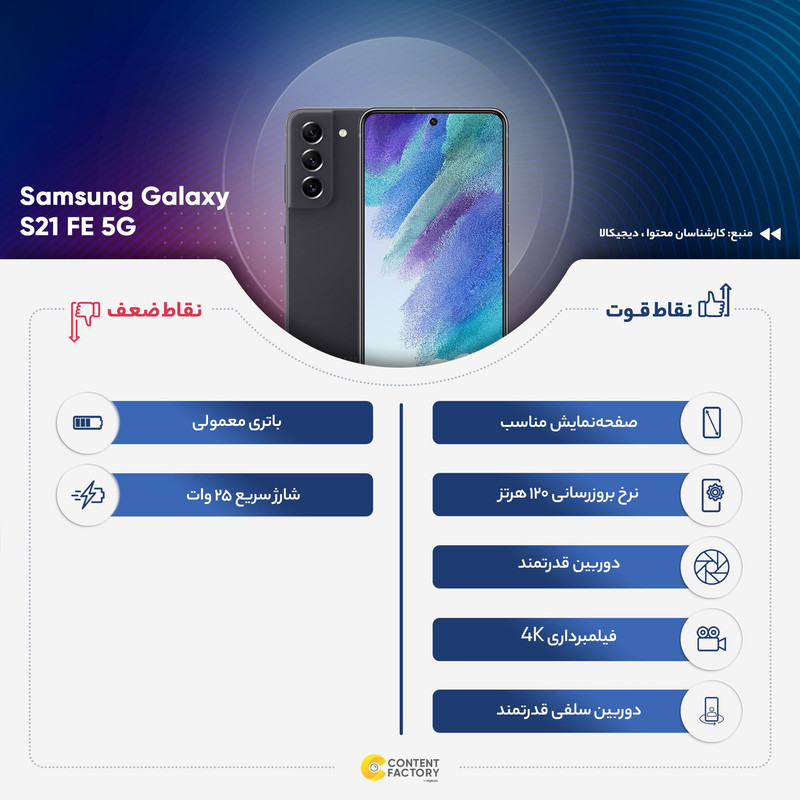 سری FE گوشی‌های هوشمند سامسونگ با توجه به بهره بردن از مشخصات فنی مناسب و قدرتمند و البته قیمتی مقرون به‌صرفه‌تر به نسبت پرچمداران این شرکت، طرفداران بسیاری زیادی دازند و توانسته‌اند عملکرد بسیار خوب و قابل قبولی را به‌نمایش بگذارند. سامسونگ Galaxy S21 FE 5G به عنوان جدید‌ترین گوشی‌هوشمند این سری هم به مشخصات فنی قدرتمند و بسیار خوبی مجهز شده است. در نمای رو‌به‌رویی این گوشی از صفحه‌نمایش با ابعاد 6.4 اینچ و رزولوشن 1080×2340 پیکسل از نوع Dynamic AMOLED 2X بهره برده است. تا همینجا هم مشخص است که این گوشی به یکی از قدرتمند‌ترین صفحات‌نمایش مجهز شده است اما وقتی به قدرت واقعی این صفحه‌نمایش پی‌ خواهید برد که بدانید توانایی نمایش 403 پیکسل در هر اینچ و حداکثر نرخ بروزرسانی 120 هرتز را دارد. در قسمت پشتی هم یک سنسور دروبین اصلی با رزولوشن 12 مگاپیکسل و گشودگی دریچه دیافراگم f/1.8 در کنار سنسور 8 مگاپیکسل از نوع تله‌فوتو با قابلیت زوم سه برابری اپتیکال (زوم بدون کم شدن کیفیت) و سنسور 12 مگاپیکسل از نوع فوق عریض (ultrawide) با زاویه دید 123 درجه، سنسور‌های دوربین سه‌گانه سامسونگ Galaxy S21 FE 5G را تشکیل می‌دهند. برای دوربین سلفی هم سنسور با رزولوشن 32 مگاپیکسل از نوع عریض در نظر گرفته شده است. در بخش مشخصات سخت‌افزاری در نظر گرفته شده هم این گوشی دست پر وارد میدان رقابت شده است. حضور پردازنده اسنپدراگون 888 5G سبب شده تا سامسونگ Galaxy S21 FE 5G توانایی اجرای بازی‌های سنگین مثل کال‌آف‌دیوتی مویابل و آسفالت 9 را به‌راحتی اجرا کند و عملکرد بسیار خوبی داشته باشد. از طرفی این پردازنده توانایی پشتیبانی از شبکه‌های اینترنتی نسل پنجم یا همان 5G را هم دارد. باتری با میزان ظرفیت 4500 میلی‌آمپر‌ساعت و شارژر 25 وات مجهز به تکنولوژی شارژ سریع هم از دیگر مشخصات در نظر گرفته شده برای این گوشی هوشمند است. گوشی‌های اکتیو هم به این شکل هستند که به دلیل محدودیت‌های برخی از محصولات برای کشور ایران، در کشور‌های همسایه به‌صورت رسمی با یک بار قرار گرفتن سیم‌کارت، اکتیو شده تا امکان استفاده در کشور وجود داشته باشد و پلمپ می‌شوند و باید بدانید که این پروسه هیچ مشکلی در راستای گارانتی کالا به‌همراه ندارد.