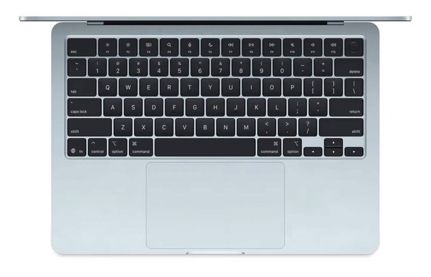 بدنه آلومینیومی با ابعاد ۳۰۴.۱×۲۱۵×۱۱.۳ میلیمتر و وزن تنها ۱.۲۴ کیلوگرم، همان حس مکبوک ایر را منتقل میکند: مینیمالیستی، مقاوم و قابلحمل. لبهها با دقت ماشینکاری شده و تناسب سختافزاری با زبان طراحی اپل هماهنگ است. بدنه فلزی نهتنها دوام دستگاه را افزایش داده، بلکه نقش موثری در دفع حرارت بدون استفاده از فن ایفا میکند. کیبورد Magic Keyboard با نور پسزمینه سفید، فاصله استاندارد و بازخورد کلیدها برای تایپ طولانیمدت دلپذیر است. نور پسزمینه یکنواخت، کار در شرایط نور کم را ساده میسازد. تاچپد Force Touch با حساسیت فشار و پشتیبانی از ژستهای چندلمسی، تعامل روان با macOS را تضمین میکند. حسگر اثر انگشت (Touch ID) در بالا سمت راست کیبورد، امنیت و سرعت ورود به سیستم را ارتقاء میدهد.