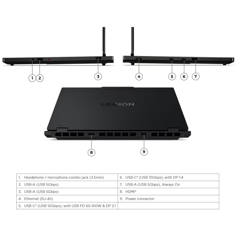 | سایر توضیحات درگاههای ارتباطی | دو عدد USB-C (از نوع USB 3.2 Gen2 با سرعت 10 گیگابیت بر ثانیه، یک عدد با پشتیبانی از DisplayPort 1.4، یک عدد با پشتیبانی از DisplayPort ۲.۱ و شارژ ۶۵ تا ۱۰۰ وات) / سه عدد USB-A (از نوع Gen۱ با سرعت ۵ گیگابیت بر ثانیه، یک عدد Always On) |