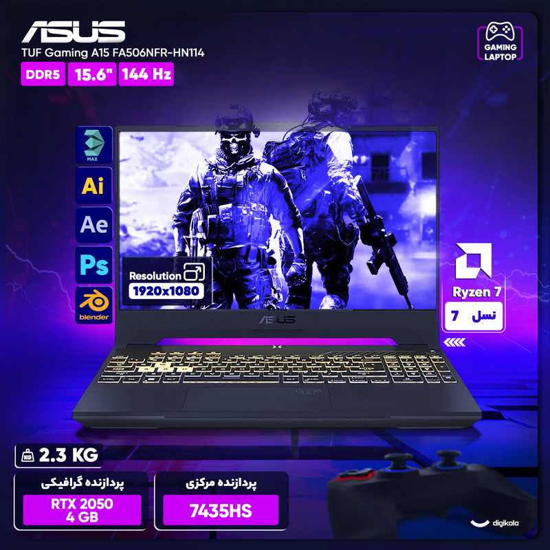 لپ تاپ 15.6 اینچی ایسوس مدل TUF Gaming F15 FA506NFR-HN114 یک نمونه اقتصادی برای گیمرهای سطح پایه است که میخواهند یک لپ تاپ کاربردی در اختیار داشته باشند. سری TUF Gaming با فروش بالا، محبوبیت خود را بارها اثبات کرده است. پورتهای ورودی و خروجی کامل هستند و اطراف لپ تاپ سه اگزوز خروجی هوای گرم دیده میشود. صفحهکلید کامل این لپ تاپ با کیبورد بعضی مدلهای TUF Gaming یکسان است، اما همچنان تجربه کاربری دلپذیر و عملکردی بینقص ارئه میکند. تاچپد روی این مدل با ابعاد بزرگ، دقت و ردیابی خوبی دارد و البته بر خلاف بسیاری از لپ تاپهای کنونی که از نوع کلیکپد هستند، کلید کلیک مجزا را به خدمت گرفته است. قلب تپنده این لپ تاپ پردازنده AMD مدل Ryzen 7 است. یک پردازنده 8 هستهای با 16 رشته موازی که توان پردازشی قابلقبولی دارد. بجز تراشهگرافیکی یکپارچه، تراشهگرافیکی مجزا RTX 2050 انویدیا با 4 گیگابایت حافظه تصویری این لپ تاپ را همراهی میکند. در کنار رم DDR5 و حافظه داخلی از نوع SSD، یک نمایشگر 15.6 اینچی با روکش مات از نوع IPS روی این مدل قرارگرفته که با نرخ تازهسازی تصویر 144 هرتز هدفی جز سرعت بالا برای گیمرها ندارد.