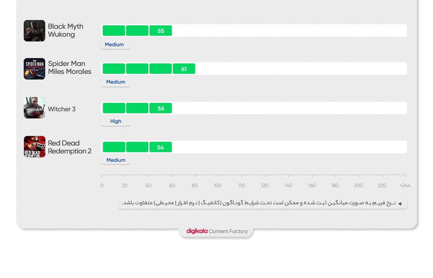 بر اساس تستها و اعلام اعداد رسمی، بازیهایی مانند Red Dead Redemption 2 با تنظیمات Medium در این لپتاپ میانگین ۵۴ فریم، Witcher 3 با تنظیمات High به ۵۶ فریم، Marvel’s Spider Man Miles Morales در تنظیمات Medium به ۶۱ فریم و Black Myth: Wukong با تنظیمات Medium به ۵۵ فریم میرسد. این نتایج حاکی از آن است که RTX 2050 تا حدودی میتواند بازیهای امروزی را در وضوح Full HD با تنظیمات متوسط اجرا کند و به نرخ فریم قابل قبولی دست یابد. اگر به تنظیمات پایینتر رضایت دهید، میتوانید فریمریت بالاتری نیز کسب کنید.