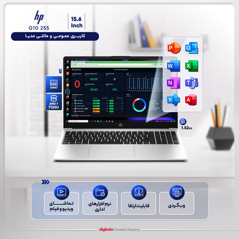 لپتاپ اچپی G10 255 با پردازنده نسل هفتم AMD Ryzen از دسته مدلهای اقتصادی این برند محسوب میشود که برای استفاده روزمره و کاربری عمومی کاملاً مناسب است. این لپتاپ اقتصادی ۱.۵۲ کیلوگرم وزن و ۱۸.۶ میلیمتر ضخامت دارد تا قابلیت حمل بالایی داشته باشد. صفحهنمایش مات ۱۵.۶ اینچی TN این لپتاپ اقتصادی ویژگیهایی چون رزولوشن Full HD، روشنایی ۲۵۰ نیت و نرخ نوسازی تصویر ۶۰ هرتز را با خود یدک میکشد. کیبورد فولسایز مجهز به نامبرپد، تاچپد با پشتیبانی از چند لمس همزمان و ژستهای لمسی ویندوز، وبکم با وضوح HD 720p و دو عدد بلندگوی داخلی استریو نیز از دیگر مشخصات آن در این بخش بهشمار میروند. پردازنده AMD Ryzen Athlon Silver 7120U به عنوان قلب تپنده این لپتاپ، از دو هسته با حداکثر فرکانس ۳.۵ گیگاهرتزی و دو رشته پردازشی قدرت میگیرد. با این مشخصات، لپتاپ G10 255 برای اموری مانند وبگردی، پخش ویدیو، استفاده از مجموعه مایکروسافت Office و تولید محتوای متنی مناسب است. ماژول گرافیکی یکپارچه AMD Radeon 610M نیز برای پردازشهای گرافیکی معمولی و سبک میتواند نقش خوبی ایفا کند. بخش درگاههای ارتباطی این لپتاپ اچپی از دو عدد USB-A 3.2، یک USB-C، خروجی HDMI و جک هدفون تشکیل شده است. ارتباطات بیسیم این لپتاپ نیز بهلطف پشتیبانی از استانداردهای Wi-Fi 6 و بلوتوث 5.3 بهروز محسوب میشود. اچپی از اسلاتهای قابل ارتقای حافظه رم DDR4 با سرعت ۳۲۰۰ مگاهرتز و حافظه ذخیرهسازی پرسرعت SSD M.2 NVMe PCIe استفاده کرده است. باتری دستگاه نیز ۴۱ وات ساعت ظرفیت دارد تا برای چند ساعت استفاده عمومی دوام بیاورد.