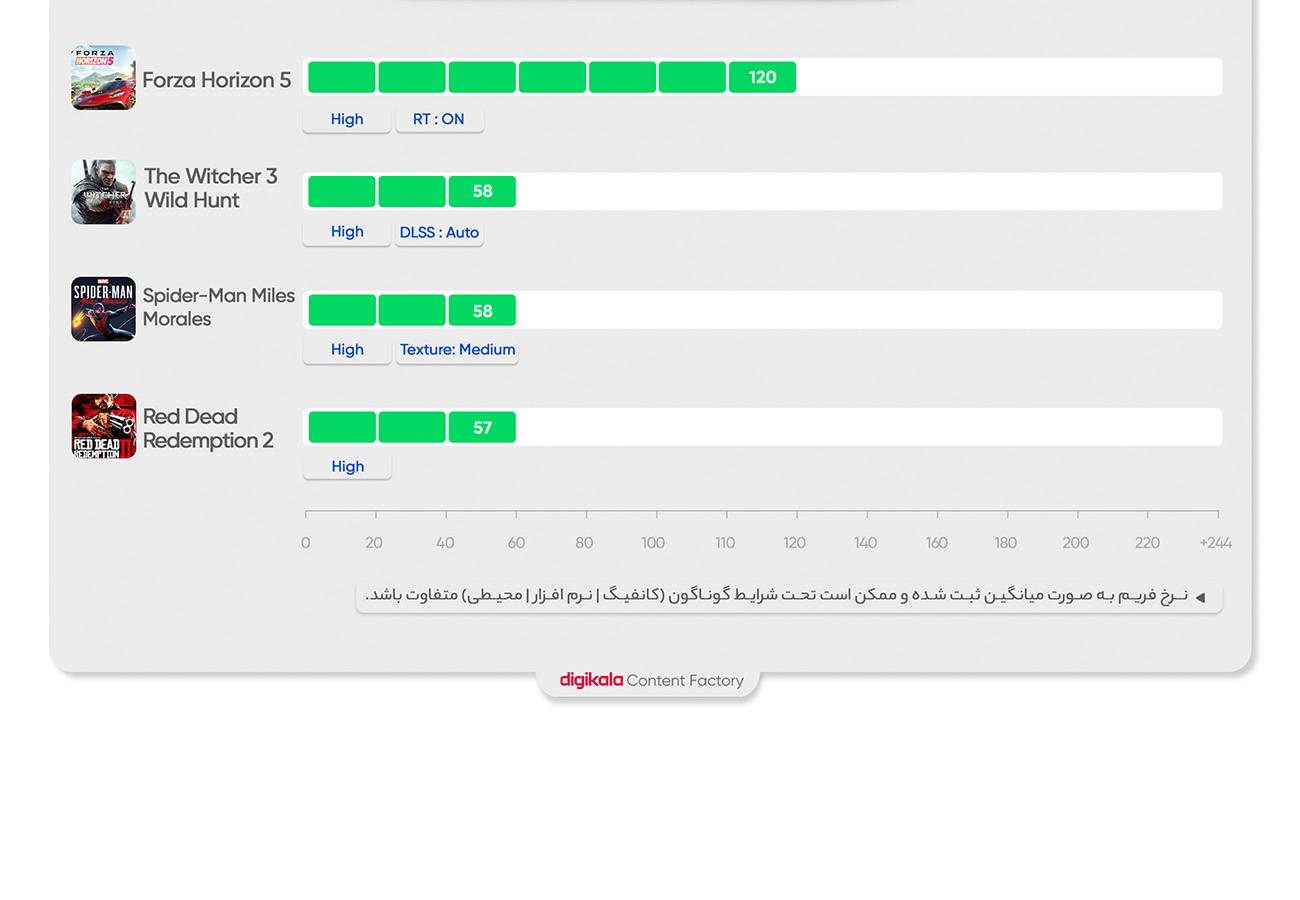 برای بررسی بهتر عملکرد این لپتاپ گیمینگ، چند بازی مختلف رو با وضوح Full HD و ۱۶ گیگابایت حافظه رم، اجرا و بررسی کردیم. بازی Red Dead Redemption 2 با تنظیمات گرافیکی High، با میانگین ۵۷ فریم در ثانیه اجرا شد. تو بازی Spider-Man Miles Morales هم با گرافیک High و Texture Medium، به میانگین ۵۸ فریم در ثانیه رسیدیم. بازی Forza Horizon 5 نیز با تنظیمات High و RT روشن، میانگین ۱۲۰ فریم در ثانیه را به ما داد. بازی Hogwarts Legacy با تنظیمات گرافیکی High و RT خاموش، با میانگین ۵۶ فریم در ثانیه اجرا شد.