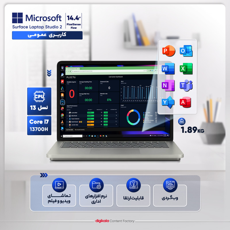 لپتاپ Surface Studio 2 مایکروسافت با نمایشگر لمسی ۱۴.۴ اینچی و طراحی مینیمالیستی، گزینهای بسیار مناسب برای کاربران حرفهای و دانشجویان است. این دستگاه با وزن ۱.۸۹ کیلوگرم و ضخامت ۲۱.۸ میلیمتر، طراحی شیک و سبکی دارد که آن را برای استفاده روزمره و جابهجایی مداوم ایدهآل میسازد. بدنه آلومینیومی آن از استحکام بالایی برخوردار بوده و به زیبایی ظاهری دستگاه میافزاید. یکی از ویژگیهای بارز این لپتاپ، قابلیت استفاده در سه حالت مختلف است: حالت لپتاپ برای کارهای روزمره مانند تایپ و وبگردی، حالت استیج که با خم کردن نمایشگر به جلو، امکان طراحی و ارائه محتوا را فراهم میکند و حالت استودیو که در آن نمایشگر بهطور کامل روی کیبورد قرار میگیرد و فضایی مناسب برای طراحی با قلم سرفیس را ایجاد میکند. Surface Studio 2 به پردازنده Intel Core i7-13700H Evo با ۱۴ هسته (شش هسته Performance و هشت هسته Efficient) و فرکانس ۵.۰ گیگاهرتز در حالت توربو و پردازنده گرافیکی Intel Iris Xe Graphics مجهز است. این مشخصات به آن اجازه میدهد تا پردازشهای پیچیده و برنامههای سنگین را به خوبی اجرا کند. حافظه رم این دستگاه LPDDR5X با سرعت ۵۲۰۰ مگاهرتز و حافظه داخلی SSD M.2 NVMe PCIe Gen4، به کاربران این امکان را میدهد تا حافظه را تعویض کنند. نمایشگر این لپتاپ با وضوح ۲۴۰۰ در ۱۶۰۰ پیکسل و نرخ نوسازی ۱۲۰ هرتز، تجربه بصری بسیار خوبی را ارائه میدهد و از قلم Surface Slim Pen 2 نیز پشتیبانی میکند. باتری ۵۸ واتساعتی آن میتواند در شرایط استفاده معمولی، حدود ۱۶ تا ۱۸ ساعت شارژدهی داشته باشد. همچنین، با مجموعهای از پورتها از جمله USB-C و USB-A و قابلیتهای ارتباطی مدرن مانند Wi-Fi 6E و بلوتوث ۵.۳، این لپتاپ امکانات متنوعی را به کاربران ارائه میدهد.