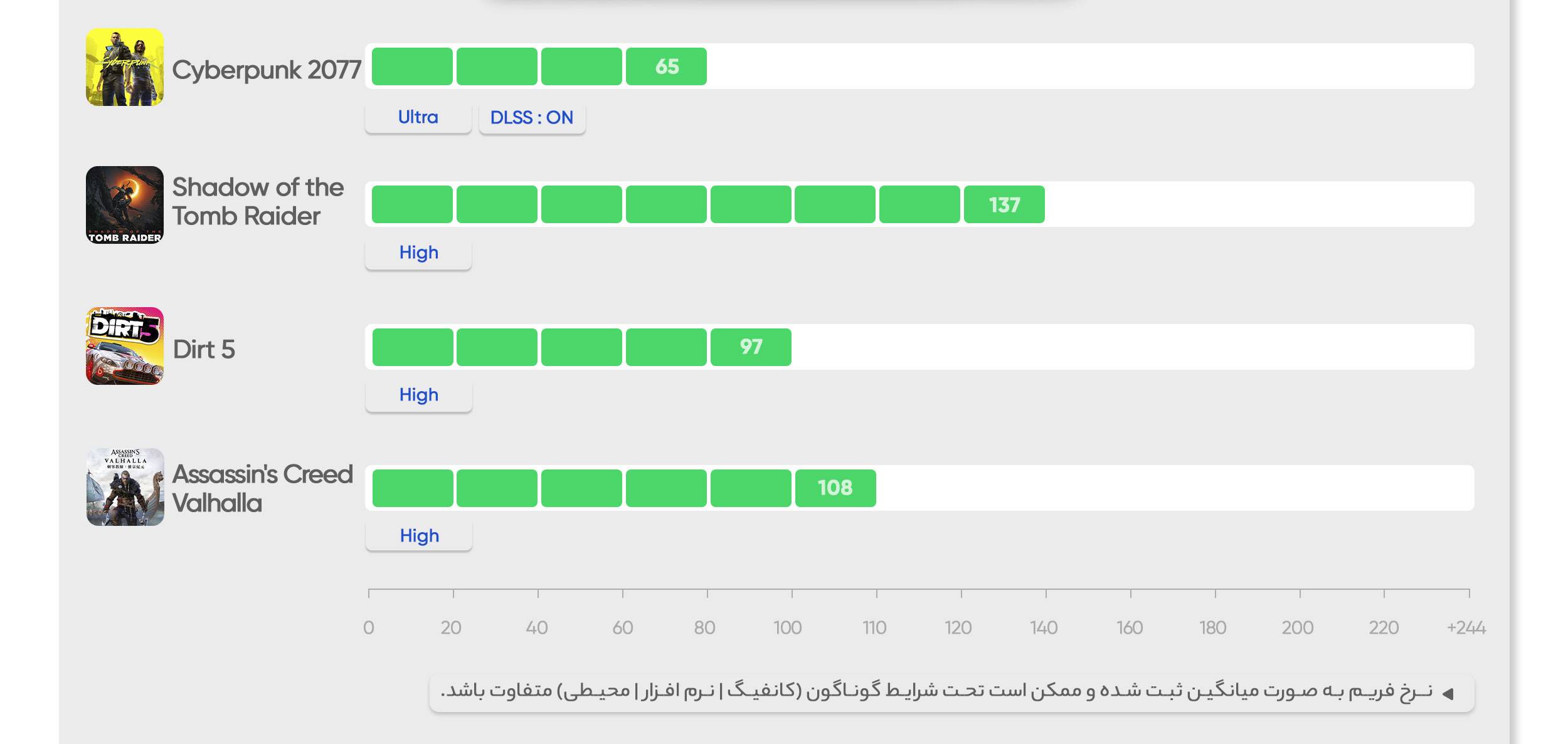 برای بررسی بهتر عملکرد لپتاپ گیمینگ Legion Pro 5، چند بازی مختلف را با وضوح 1600p و ۱۶ گیگابایت حافظه رم تست کردیم. بازی Cyberpunk 2077 با تنظیمات Ultra و DLSS روشن، با میانگین ۶۵ فریم در ثانیه اجرا شد. بازی Shadow of the Tomb Raider با تنظیمات High، میانگین ۱۳۷ فریم در ثانیه را به ما داد. بازی Dirt 5 هم با تنظیمات High، به میانگین ۹۷ فریم در ثانیه رسید. این نتایج نشان میدهد که لپتاپ Legion Pro 5 میتواند بازیهای روز را با تنظیمات گرافیکی بالا و نرخ فریم روان اجرا کند و تجربه گیمینگ لذتبخشی را برای شما رقم بزند.