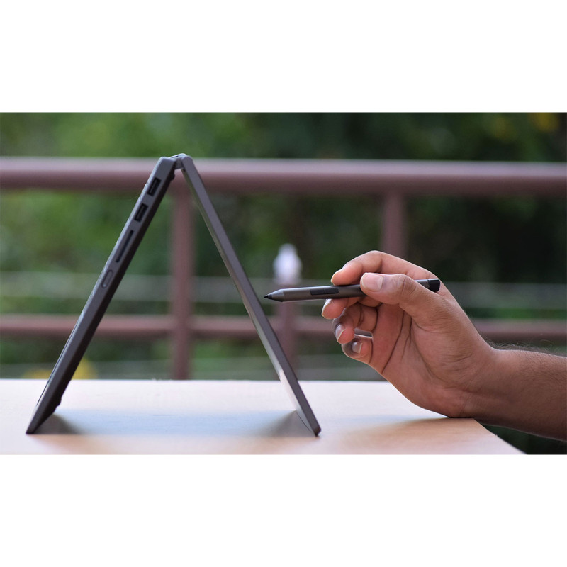 این لپتاپ دارای پورتهای متنوعی است. دو درگاه USB-A 3.2 Gen1 داریم که اطلاعات را با سرعت خوبی انتقال میدهند. همچنین دو پورت USB-C 3.2 Gen2 روی بدنه این دستگاه دیده میشود که از DisplayPort و Power Deliver پشتیبانی میکنند. شیار کارت حافظه، خروجی ویدیو HDMI 1.4 و جک ۳.۵ میلیمتری صدا، سایر ورودیها و خروجیهای این لپتاپ را تشکیل میدهند. در نهایت، پشتیبانی از تکنولوژیهای وایفای 6 و بلوتوث 5.2، به شما کمک میکند تا سریعا به اینترنت جهانی متصل شوید و لپتاپ خود را به راحتی به دستگاههای دیگر متصل کنید. صفحهنمایش لمسی و ۱۴ اینچی این لپتاپ با وضوح ۱۹۲۰ در ۱۲۰۰ پیکسل (WUXGA) و پنل IPS، تصاویر با کیفیت و شفافی را به مخاطبان نمایش میدهد. این صفحهنمایش با نرخ بهروزرسانی ۶۰ هرتز و پوشش ۴۵ درصدی دامنه رنگی NTSC، یک تجربه کاربری استاندارد و قابل قبول را به شما ارائه میدهد. این نمایشگر لمسی از حداکثر ۱۰ لمس همزمان پشتیبانی میکند. به لطف قابلیت چرخش ۳۶۰ درجه، میتوانید نمایشگر را به شکل کامل بچرخانید و با استفاده از قلم لنوو Digital Pen 2، کارهایی مثل طراحی، نقاشی و یادداشتبرداری انجام بدهید. روشنایی ۳۰۰ نیت چندان قابل توجه نیست، اما میتواند تو محیطهای داخلی جوابگو باشد. این نمایشگر جلوی نور آبی مضر هم میگیرد که آسیب به چشمان شما را کاهش میدهد.
