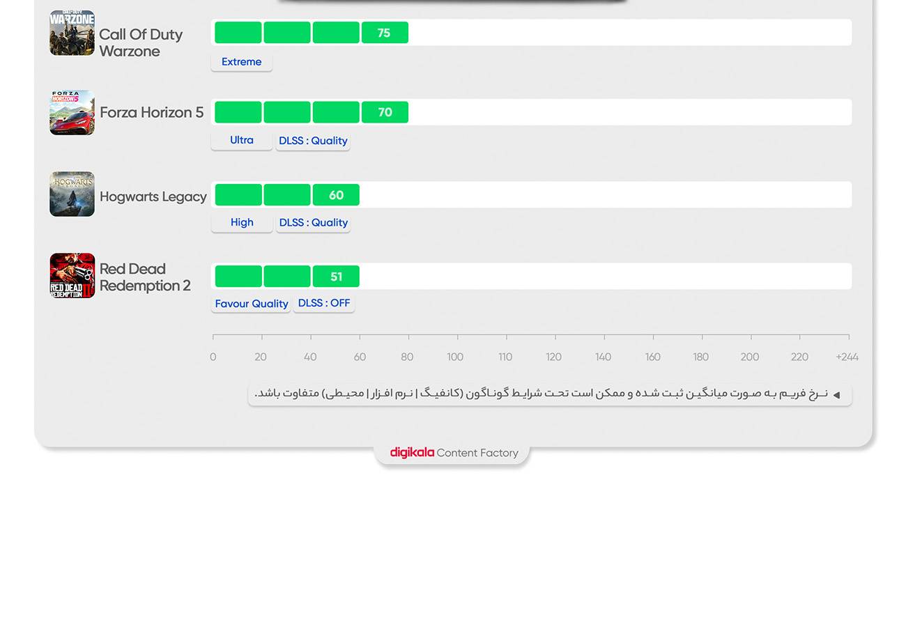 برای ارزیابی عملکرد این لپتاپ در بازیها، چند عنوان مختلف را با وضوح Full HD و تنظیمات گرافیکی متفاوت اجرا کردیم. بازی Cyberpunk 2077 با تنظیمات گرافیکی Medium و فعالسازی DLSS، میانگین ۵۵ فریم در ثانیه ثبت شد. Call of Duty: Warzone با تنظیمات High، عملکرد روان داشت و به میانگین ۶۰ فریم در ثانیه رسید. Forza Horizon 5 در تنظیمات Ultra، به میانگین ۵۰ فریم در ثانیه رسید.