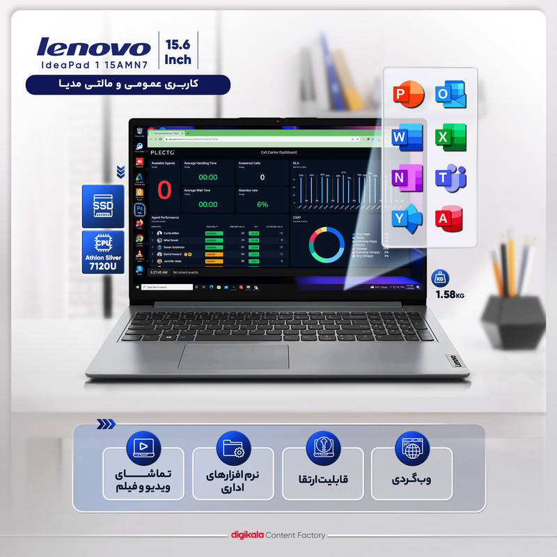 لپتاپ لنوو IdeaPad 1 مدل 15AMN7، با تکیه بر پردازنده ایامدی Athlon Silver 7120U و حافظه رم پرسرعت LPDDR5، یک گزینه اقتصادی برای کاربرانی محسوب میشود که میخواهند با کمترین هزینه، امور روزمره، دانشجویی و تحقیقاتی خود را به راحتی انجام دهند. این لپتاپ با وزن ۱.۵۸ کیلوگرم و ضخامت ۱۷.۹ میلیمتر، حمل بسیار آسانی دارد و بدنه پلاستیکی ABS آن، علاوه بر سادگی و زیبایی، دوام نسبی خوبی هم ارائه میدهد. کیبورد فولسایز جزیرهای این مدل، برای تایپ سریع و راحت مناسب است و تاچپد چندلمسی، کنترل دقیقی را به کاربر ارائه میدهد. اسپیکرهای داخلی دالبی نیز صدای قابل قبولی را در فضاهای نسبتا کوچک به گوش میرسانند. وجود وبکم HD 720p، کیفیتی پایه و مناسب را برای تماسهای تصویری فراهم میکند. درگاههای این لپتاپ شامل یک پورت USB-A 2.0، یک پورت USB-A 3.2 نسل اول، یک پورت USB-C 3.2 نسل اول، خروجی HDMI، Wi-Fi 6 و شیار کارت حافظه است که امکان اتصال لوازم جانبی مورد نیاز کاربر را فراهم میآورد. نمایشگر مات ۱۵.۶ اینچی TN با وضوح HD و روشنایی ۲۲۰ نیتی، برای تماشای فیلم، وبگردی و کارهای روزمره کافی است. به لطف باتری سه سلولی ۴۲ واتساعتی، لپتاپ بین دو تا سه ساعت شارژدهی ارائه میدهد. در نهایت، پردازنده Athlon Silver 7120U مناسب انجام کارهای سبک است و نباید انتظار اجرای نرمافزارهای سنگین یا بازیهای گرافیکی را داشت. اما برای کاربرانی که به دنبال دستگاهی ساده، سبک و مقرونبهصرفه هستند، IdeaPad 1 15AMN7 میتواند گزینهای عالی باشد.