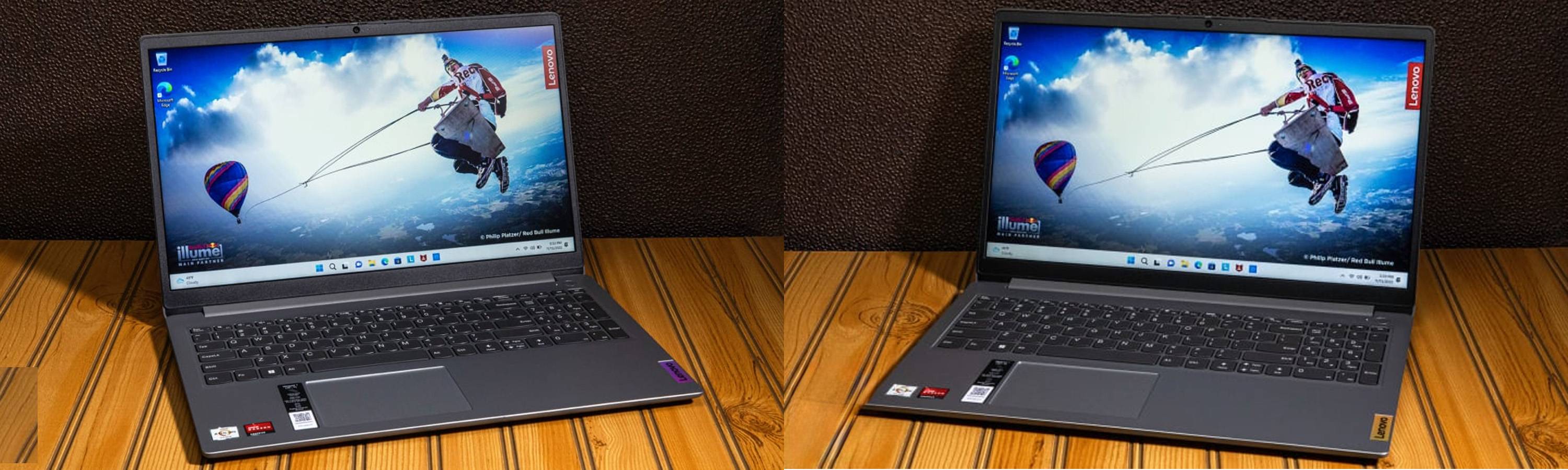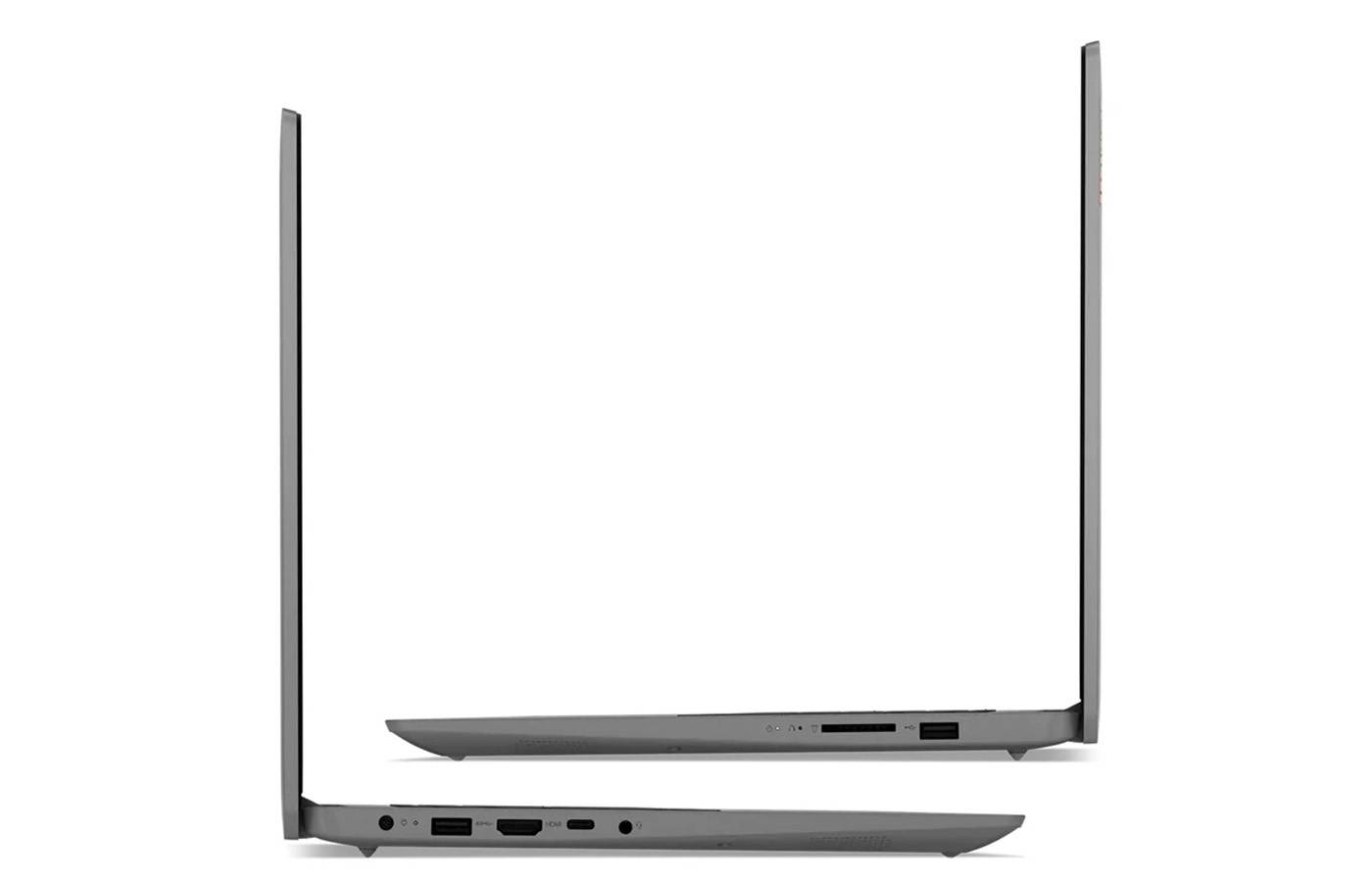 در قسمت درگاهها، یک درگاه USB-A 2.0 و یک درگاه USB-A 3.2 نسل ۱ برای این دستگاه تعبیه شده که این تعداد برای استفادهی روزمره کافی است. همچنین یک درگاه USB-C 3.2 نسل ۱ هم موجود است. سوکت شارژ، شیار کارت حافظه، خروجی تصویر HDMI و جک ۳/۵ میلیمتری صدا، سایر درگاههایی هستند که روی این لپتاپ میبینیم. صفحهنمایش این مدل اقتصادی از سری IdeaPad، یک پنل ۱۵/۶ اینچی TN با رزولوشن HD دارد و ابتداییترین کیفیت موجود در بازار را ارائه میدهد. نرخ بهروزرسانی ۶۰ هرتز و حداکثر روشنایی ۲۲۰ نیت، نشان میدهند که این نمایشگر فقط برای وبگردی، تماشای فیلم با کیفیت HD و استفادهی روزمره مناسب است.