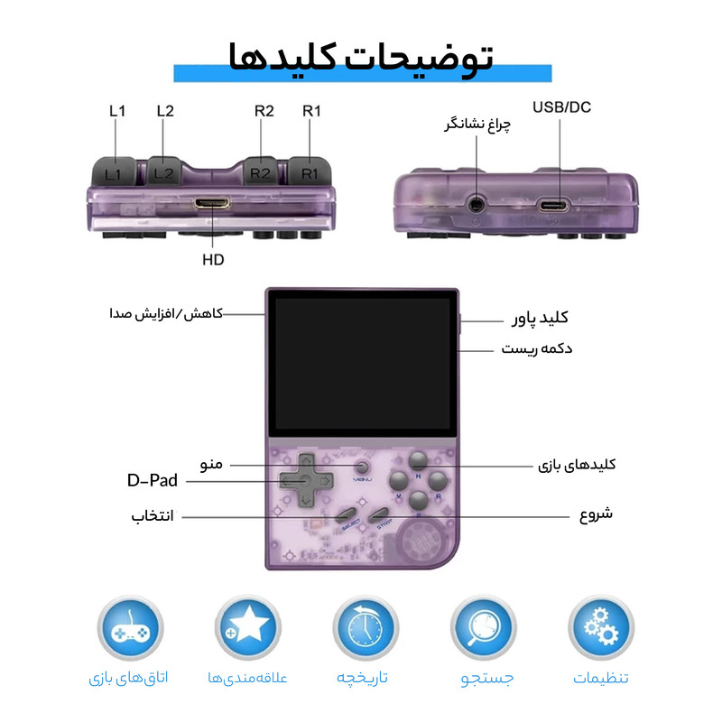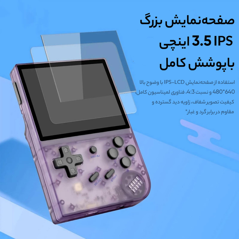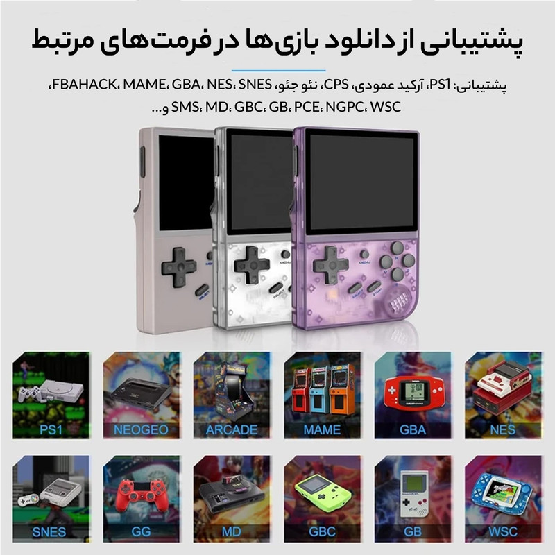 تجربه بازی های خاطره انگیز با مینی کنسول های قابل حمل Anberic RG35XX با بیش از 5000 بازی نوستالژیک و جدید و کیفیت ساخت بسیار عالی می تواند بهترین همراه شما باشد.کنسول بازی RG35XX از یک باتری لیتیومی 2100 میلی آمپر ساعتی استفاده می کند. این می تواند بازی های رقابتی را برای مدت طولانی بدون نگرانی در مورد نیاز به شارژ مکرر در مدت زمان کوتاه انجام دهد. عمر باتری تا 5 ساعت است.پشتیبانی از دهها شبیهساز و انواع بازی های ماجراجویی، اکشن، مسابقهای و ..... را پوشش میدهد. ما صفحه نمایش پیشرفته IPS و سیستم لینوکس را بکارگرفته ایم و با هسته بسیار سازگار پردازنده داخلی ATM7039S چهار هسته ای ARM Cortex-A9 و پردازنده گرافیکی چهار هسته ای PowerVR SGX544MP. بازی ها روان تر اجرا می شوند. پشتیبانی از دسته بی سیم 2.4G و اتصال دسته سیمی به منظور افزایش لذت کاربری در بازی، همچنین کنسول بازی از عملکردهای خروجی HDMI و تلویزیون پشتیبانی می کند تا صفحه نمایش کوچک در عرض چند ثانیه بزرگتر شود و از اتصال جوی استیک در بازی های چند نفره نیز پشتیبانی می کند.تعدادی پورت کاربردی برای این محصول در نظر گرفته شده است. یک پورت mini HDMI در قسمت بالایی این محصول تعبیه شده است. با استفاده از این پورت می توانید دستگاه بازی خود را به صفحه نمایشگر دیگری متصل کرده و بازی ویدیویی را در آن پخش کنید. در قسمت پایینی این کنسول بازی دو پورت وجود دارد. پورت اول Type-C است که برای اتصال کابل شارژ در نظر گرفته شده و پورت دوم جک 3.5 میلی متری است که برای اتصال هدست در این قسمت تعبیه شده است. طراحی فیزیکی این دستگاه بازی متناسب با ارگونومی دست انسان انجام شده است. به گونه ای که به راحتی در دست های شما قرار گفته و بعد از استفاده های طولانی مدت باعث ایجاد احساس خستگی و یا درد در دست های گیمر نمی شود. کنترلر این محصول به دستگاه بازی متصل شده است. این کنترلر نیز اغلب دکمه هایی که در سایر دسته بازی ها دیده می شود را دارد. علاوه بر آن ها تعدادی دکمه جدید روی این کنترلر دیده می شود. در قسمت سمت راست این محصول یک دکمه reset و یک دکمه power برای روشن و یا خاموش کردن دستگاه تعبیه شده است. در قسمت سمت چپ این محصول تنها یک دکمه مخصوص برای کنترل میزان بلندی صدای پخش شده طراحی شده است.