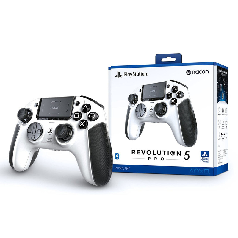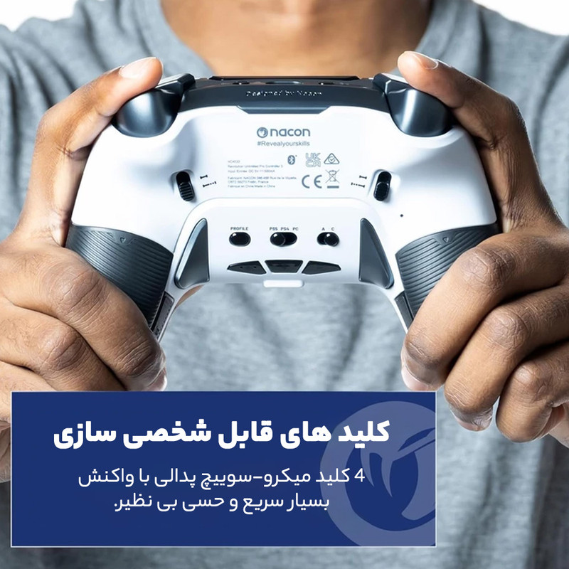 گیم پد Nacon Revolution 5 Pro، اولین گیم پد Nacon مخصوص پلی استیشن 5 است که به بازار عرضه میشود و با PS4 و استیم نیز سازگار است.این گیم پد غیرمتقارن دارای ویژگیهایی انقلابی برای بهبود دقت و عملکرد شما در بازیهای رقابتی است. گیم پد Nacon Revolution 5 Pro دارای تکنولوژی مغناطیسی هال افکت در تریگرها و آنالوگها است و قابلیتهای شخصیسازی متعددی دارد.گیم پد Nacon Revolution 5 Pro برای گیمرهای حرفهای طراحی شده که به دنبال پیروزی در رقابتها هستند. این گیم پد با تکنولوژی بهینه شده برای PS5، انتظارات شما از یک گیم پد PS5 را کاملا دگرگون میکند و دارای رابط کاربری مخصوص شخصی سازی آسان، طراحی ماژولار جدید و بهبود یافته و بدنهای راحت و در عین حال بادوام است.- گیم پد Nacon Revolution 5 Pro از تکنولوژی مغناطیسی هال افکت استفاده میکندکه نه تنها دقت آنالوگها را به شکل قابل چشم گیری افزایش میدهد، بلکه آنالوگها، بر خلاف دوال سنس و سایر گیمپدها، دچار دریفت نمیشوند. به دلیل استفاده از این تکنولوژی، این گیم پد فاقد تریگرهای تطبیقپذیر است و به جای این تکنولوژی، از قفل تریگر برای تغییر حساسیت آن استفاده میکند.گیم پد Nacon Revolution 5 Pro دارای یک دانگل اتصال بیسیم برای پلی استیشن 5، پلی استیشن 4 و کامپیوتر است و همچنین میتوانید با اتصال آن با کابل USB-C به دستگاه مورد نظر خود، هنگام استفاده، گیم پد را شارژ کنید. گیم پد Nacon Revolution 5 Pro همچنین با استفاده از بلوتوث به هدفونهای بیسیم وصل میشود و میتوانید هنگام بازی، از هدفونهای بیسیم نیز استفاده کنید. در سال 2024، اپلیکیشن موبایل این گیم پد عرضه خواهد شد و با اتصال گیم پد به گوشی هوشمند با بلوتوث، میتوانید آن را شخصی سازی کنید.گیم پد Nacon Revolution 5 Pro دارای سه ست وزنه، سه آنالوگ با طولهای مختلف، سه نوع سر آنالوگ مختلف، دو مدل D-Pad و یک جک 3.5 میلیمتری اکسترنال است تا آن را به شکلی که دوست دارید، برای بازی مورد نظر خود شخصیسازی کنید. همچنین، با استفاده از اپلیکیشن ویندوز این گیم پد میتوانید تنظیمات مورد نظر خود را در چهار پروفایل به ازای هر پلتفرم ذخیره سازی کرده و از آنها هنگام بازی استفاده کنید.